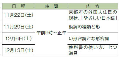 対象:18歳以上の方(原則、全4回受講できる方)で日本語教室のボランティアとして支援いただける方