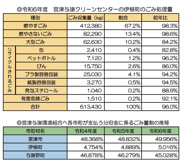 内訳を見てみると、生活ごみの大部分を占める「燃やすごみ」が、前年度と比較して7,200kg(1.7%)減少しています。しかし、人口の減少率2.5%と比較すると、逆に一人あたり排出量は増えているため、ごみの減量化が十分ではなく、宮津与謝環境組合に支払う分担金のごみ量割が毎年増加している状況です。