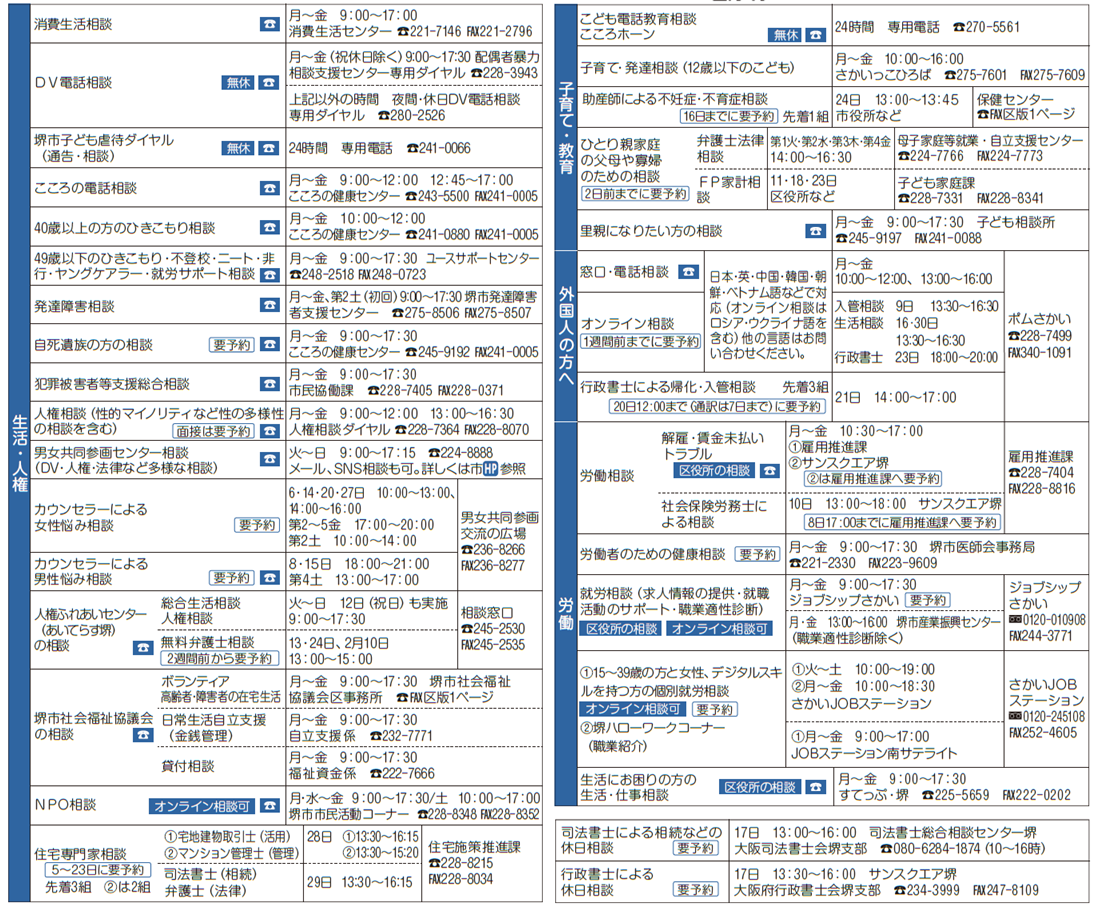 くらし 今月の相談[無料] 17/31 前の記事 次の記事 発行日 : 2026年01月01日 自治体名 : 大阪府堺市 広報紙名 : 広報さかい 2026年1月号 祝休日は休み([無休]以外) 電話マーク:電話相談可 『堺市 相談』で検索 区役所の相談:法律相談などは区版2ページ Tweet シェアする 孤独や孤立を感じている方のために LINE相談窓口を開設 情報ひろば -子育て・教育-