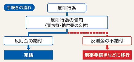 違反行為をした場合に、期限内に反則金を納付することで裁判所での審判を受けずに処理が終結する制度です。反則金を支払わない場合は刑事手続きなどに移行します。