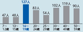 市内の自転車運転中の交通事故を年齢別に見ると16~19歳が最も多く、時間帯別では朝の時間帯に特に多く発生しています。