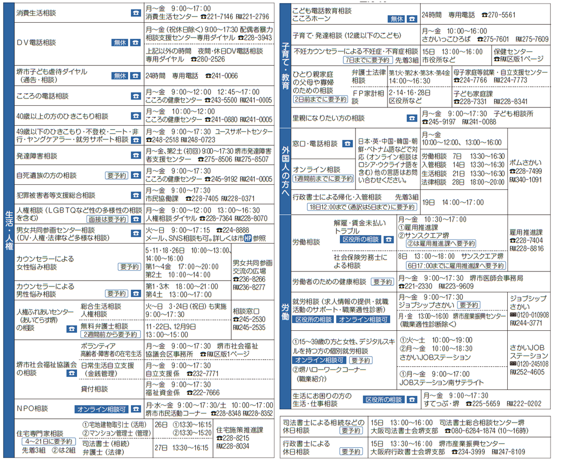 くらし 今月の相談[無料] 18/34 前の記事 次の記事 発行日 : 2025年11月01日 自治体名 : 大阪府堺市 広報紙名 : 広報さかい 2025年11月号 祝休日は休み([無休]以外) 電話マーク:電話相談可 『堺市 相談』で検索 区役所の相談:法律相談などは区版2ページ Tweet シェアする スポーツを楽しもう!イベント情報 南部丘陵の豊かな緑は堺の誇り