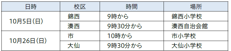 10月に実施する校区の防災訓練です。訓練に参加していざという時に備えましょう。見学のみ可能なものや事前申込が必要なメニューがあります。