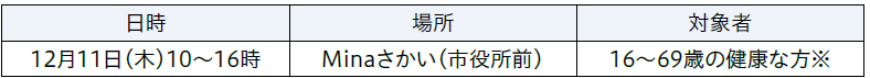 くらし 献血にご協力ください 2/15 前の記事 次の記事 発行日 : 2025年12月01日 自治体名 : 大阪府堺市堺区 広報紙名 : 堺市堺区広報紙 2025年12月号 12月は「大阪府献血推進」月間です。献血への協力をお願いします。 ※65歳以上の方は60歳以降に献血経験がある方 問合せ:堺区役所自治推進課 【電話】228-7082 【FAX】228-7844 Tweet シェアする この冬 堺区がひかり輝く 校区防災訓練の案内