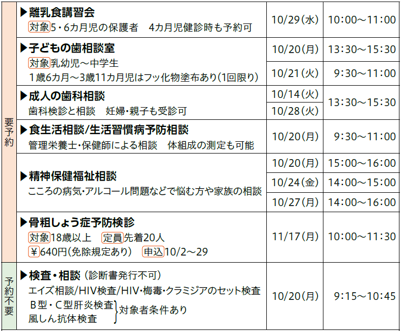 いずれも中保健センターで。内容など詳細は同センターHP(本紙3ページのQRコード)をご参照いただくか、お問い合わせください。