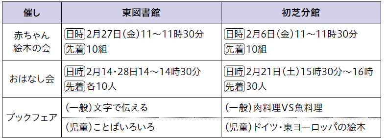 休館日:東図書館・初芝分館共通 2月2・9・16日、3月2日