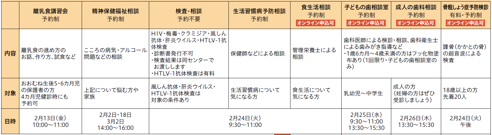 予約は電話かFAXで東保健センターへ。《オンライン申込可》はオンラインでもできます。