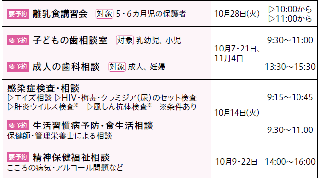 離乳食について、3回食のすすめ方や手づかみ食べについての話を行います。汁物の塩分測定を希望の方は、家庭で作った大人用のみそ汁などの汁物(50ml程度)を持参してください。
