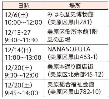 イベント 美原朝市 9/15 前の記事 次の記事 発行日 : 2025年12月01日 自治体名 : 大阪府堺市美原区 広報紙名 : 堺市美原区広報「みはら」 2025年12月号 新鮮朝どれ野菜が並びます。売り切れ次第終了。マイバッグを持参。 問合せ:美原朝市運営委員会 【電話】090-2590-8866 Tweet シェアする ド・レ・美原(ミファラ)♪マルシェ 美原区の相談・法律相談