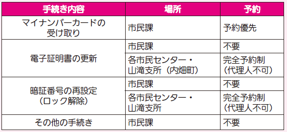 カードの受け取り(予約優先)、電子証明書の更新、住所・氏名などの変更に伴う券面事項変更などの手続きができます。
