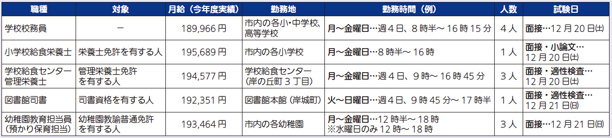申込み・問合せ:12月12日(金)(必着)までに直接または郵送で教育委員会総務課人事・給与担当へ〒596-8510