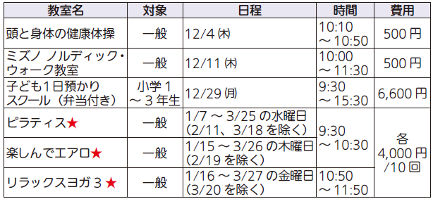 (1)(2)は前日までに電話で(★は12月8日(月)から直接)総合体育館へ【電話】441-9200