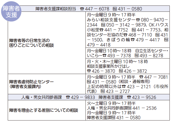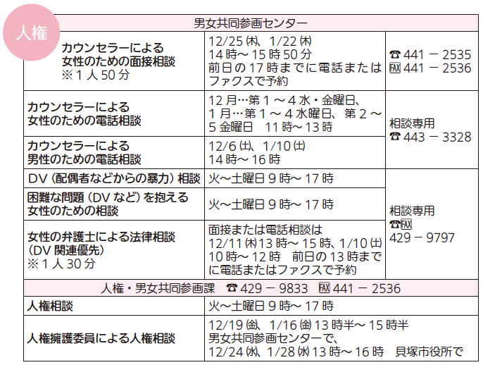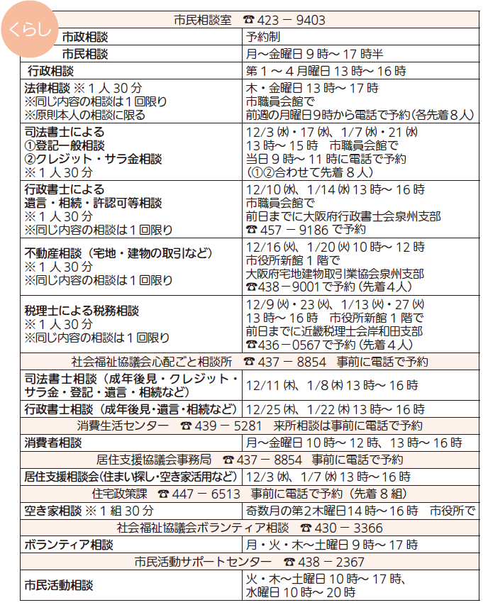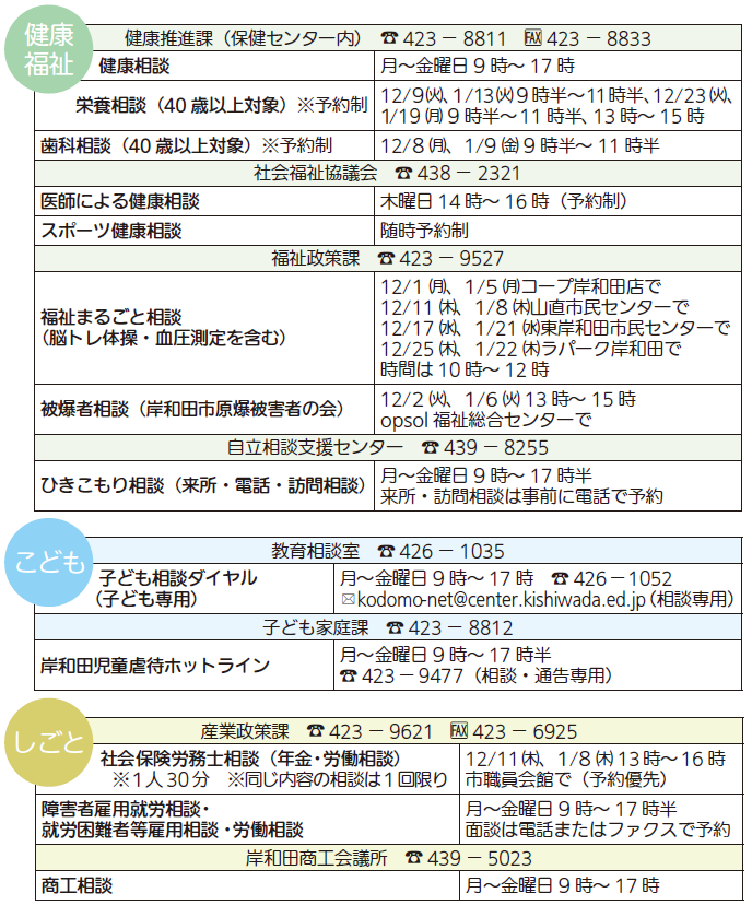 くらし 12・1月の相談 41/42 前の記事 次の記事 発行日 : 2025年12月01日 自治体名 : 大阪府岸和田市 広報紙名 : 広報きしわだ 2025年12月号 市内在住者を対象に無料で相談に応じます。秘密は厳守します。祝・休日を除きます。記載のない市外局番は「072」です。 Tweet シェアする 編集後記 その他のお知らせ(広報きしわだ 2025年12月号)