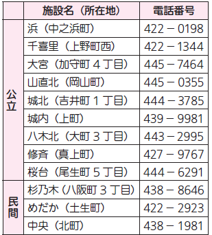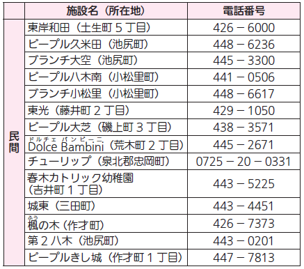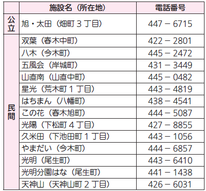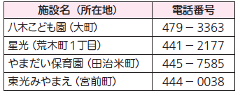 表1~4の保育施設で入所者を募集します。定員や対象年齢は市ホームページをご確認ください。入所案内・申込書類は子育て施設課や表1~3の各保育施設、各市民センター、山滝支所(内畑町)で9月1日(月)より配布します。