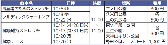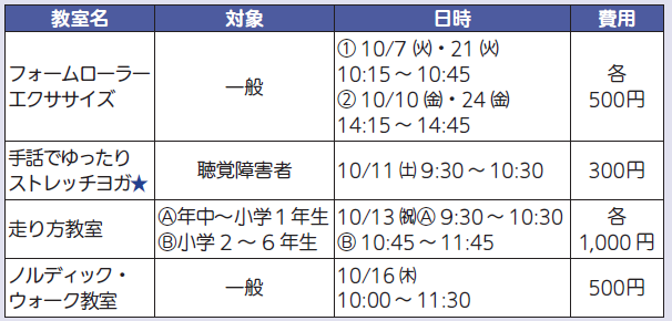 スポーツ 総合体育館のスポーツ教室 25/32 前の記事 次の記事 発行日 : 2025年10月01日 自治体名 : 大阪府岸和田市 広報紙名 : 広報きしわだ 2025年10月号 ■市内公園・運動広場教室(一般対象) ■総合体育館(西之内町)の各教室 申込み・問合せ:前日までに電話で総合体育館へ(★はファクスも可) 【電話】441-9200【FAX】441-9204 Tweet シェアする みんなで歌を楽しもう♪マドカホール歌のイベント 献血/検査/納税・納付