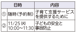 申込み・問合せ:(2)は11月18日(火)までに電話できしわだファミリー・サポート・センターへ