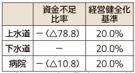 資金不足比率とは、資金不足額を料金収入の規模(事業の規模)と比較した比率で、公営企業の経営状況を示すものです。資金不足比率が経営健全化基準を超えると、健全化に向けた取り組みが義務付けられます。本市では、全ての公営企業会計で基準値を超えませんでした(表2)。