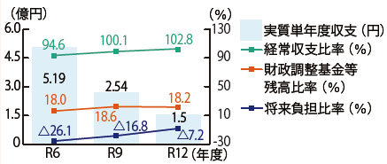 実質単年度収支と将来負担比率は目標値を達成します。経常収支比率と財政調整基金等残高比率は人件費や社会保障費などの増加により目標値未達成の見込みです。