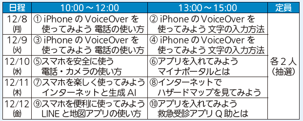 申込み・問合せ:11月4日(火)~21日(金)に電話またはファクス(氏名、電話番号、ファクス番号、使用スマホの機種、希望の講座〈複数受講可〉、点字テキスト・手話通訳の要否を記入)・QRコードでスマートフォン教室受付窓口へ