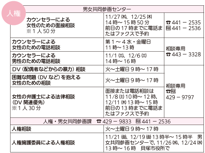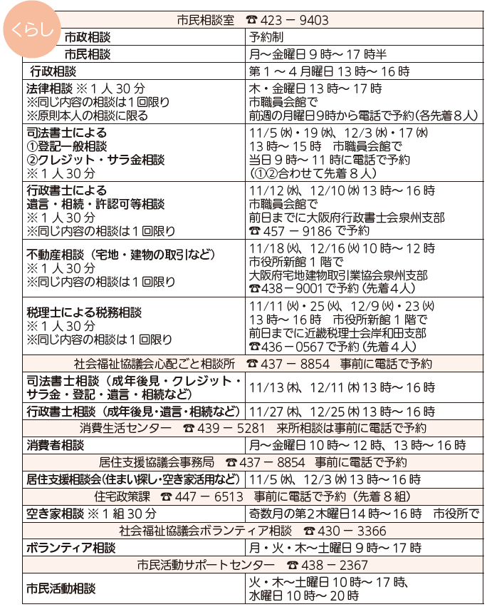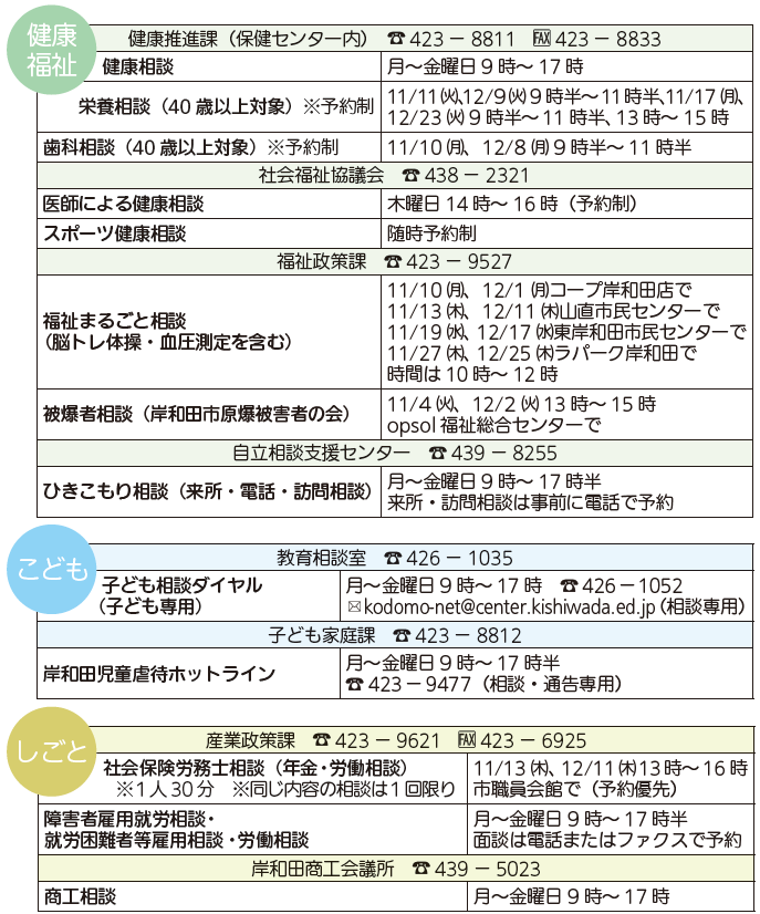 くらし 11・12月の相談 39/40 前の記事 次の記事 発行日 : 2025年11月01日 自治体名 : 大阪府岸和田市 広報紙名 : 広報きしわだ 2025年11月号 市内在住者を対象に無料で相談に応じます。秘密は厳守します。祝・休日を除きます。記載のない市外局番は「072」です。 Tweet シェアする ヒト★イロ FILE No.12 その他のお知らせ(広報きしわだ 2025年11月号)