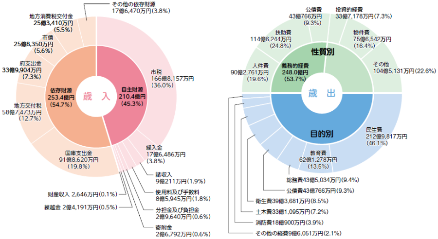 歳入総額は463億8,295万円で、前年度に比べて37億9,528万円(8.9%)の増加となりました。