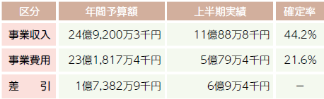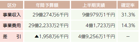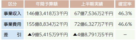 今年度上半期の収入は67億7,536万円(前年度同期比5億1,326万円増)、支出は72億6,327万円(同4億3,083万円増)となり、当期収支差引額は4億8,791万円の赤字(減価償却費の上半期予定額を含む)となっています。