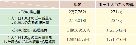 平成18年度の指定袋制導入直後に家庭ごみの排出量は大きく減少しましたが、その後はほぼ横ばいです。一人一人が1日に排出するごみを100g減量した場合、市全体で年間3,744tのごみ減量と1億8,730万円のごみ収集・処理経費の削減が見込めます(下表参照)。