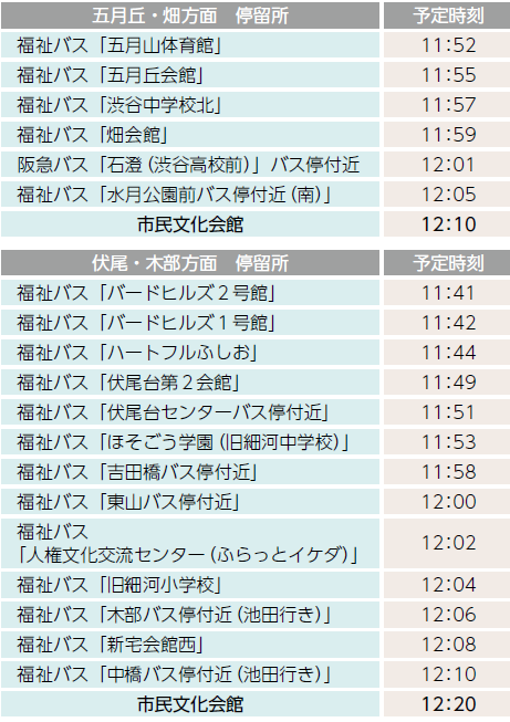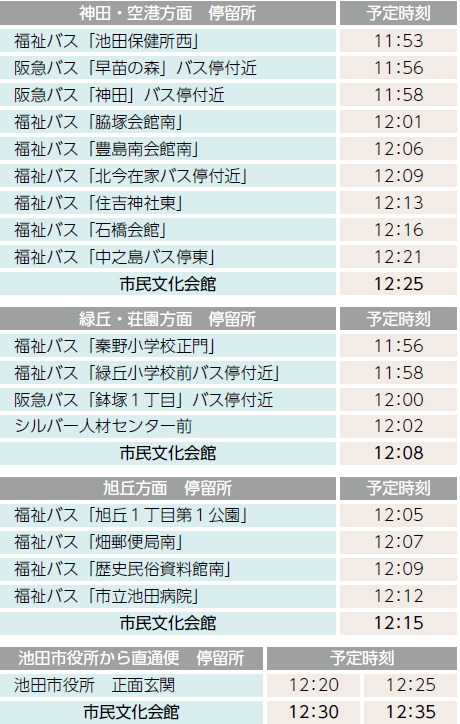 交通事情により時間が遅れる場合がありますが、ご了承ください。なお、帰りのバスの出発は、公演終了後に場内アナウンスでお知らせします。