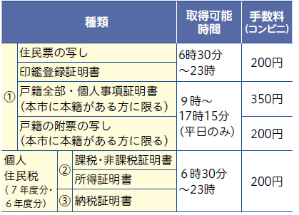 ※コンビニ交付では、印鑑登録証での印鑑登録証明書の発行はできません。伏尾台コミュニティプラザでの交付は10時~18時(休館日を除く、戸籍は17時15分まで)。税関係の証明は本市に課税情報がない場合は発行できません。納付後、納税証明書に反映されるまで最大3週間かかります。