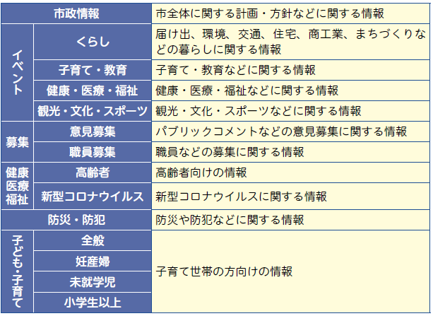市の公式LINEでは市政・災害・イベント情報などを配信しています。利用者が希望する情報を選択することでニーズに沿った情報発信や便利な情報の提供を行います。