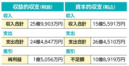 収益的収支については、収入は25億9,903万円、支出は24億4,847万円となり、差し引き1億5,056万円の黒字となりました。