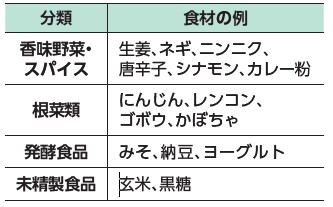 体を温める作用のある食材を積極的に食事に取り入れましょう。