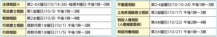 予約方法:各種相談日の週初めの月曜日(祝日・振休の場合は火曜日)に午前9時~電話受付