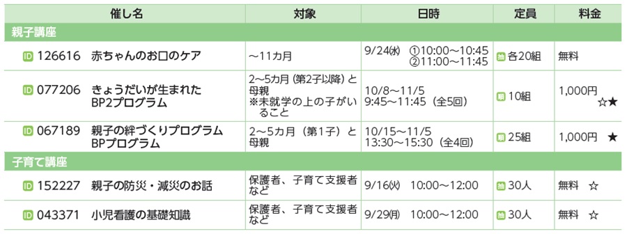 申込:9/1(月)~5(金)にウェブ申込、電話で(電話は17:00まで)★は9/8(月)9:00からウェブ申込で