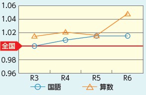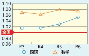 小中学校では、令和6年度の全国学力調査で好成績をキープ。学習状況調査でも課題の解決に向け、自分で考え、自分から取り組めていると感じている児童生徒の割合が増えています。
