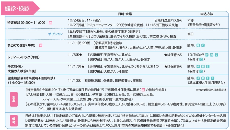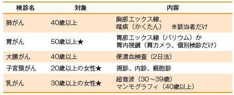 市は、右表のがん検診を無料で実施しています。ぜひ受診しましょう。なお、明らかな症状がある場合はすぐに医療機関で診療を受けてください。