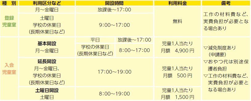 「入会児童室」は利用者負担金があり、安全確保と育成支援の機能を持った生活の場です(放課後児童健全育成事業)。