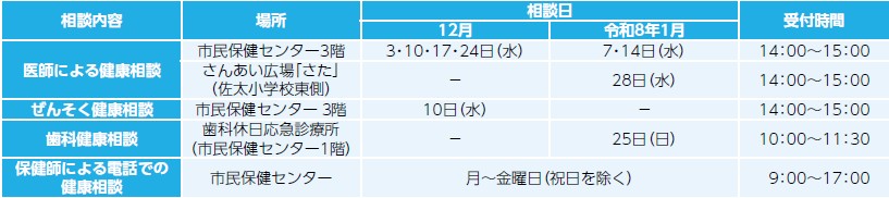 薬についての相談は、市民(特定)健診期間中の第1水曜日(12月3日)14:00~15:00に市民保健センターにて行います。