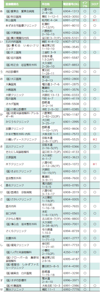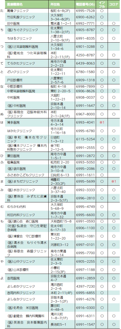 守口(下表)・門真・寝屋川・大東・四條畷市の各委託医療機関