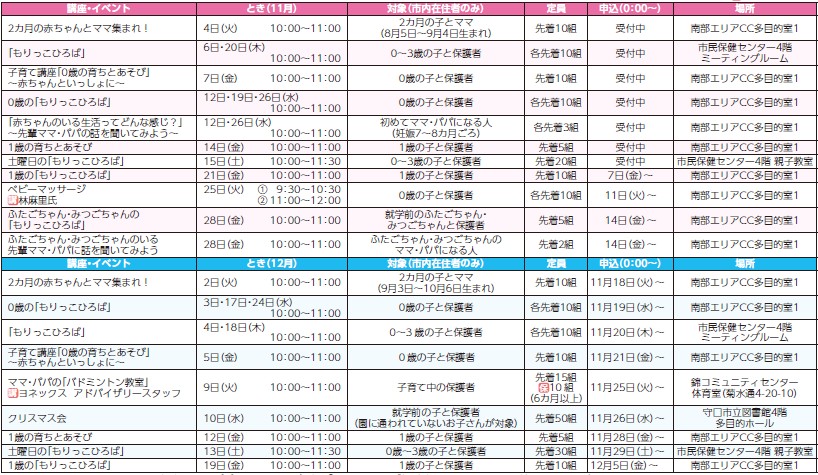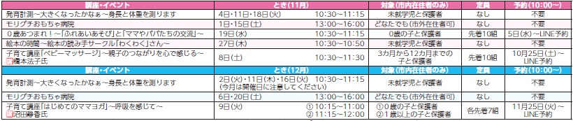 ※11月12日・26日と12月24日は、初めてママ・パパになる人たちが0歳の「もりっこひろば」に参加します。皆さんの話を聞かせてくださいね。