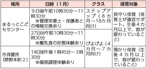 日時など:下表のとおり。対象はステップアップ=生後8カ月~18カ月の子どもの保護者、ぴよぴよ=生後4カ月~7カ月の子どもの保護者。