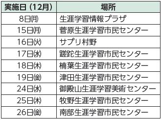 日時など:(1)12月17日(水)午前10時~11時30分、菅原生涯学習市民センター(2)12月25日(木)午後1時30分~3時、南部生涯学習市民センター。対象はおおむね65歳以上。無料。