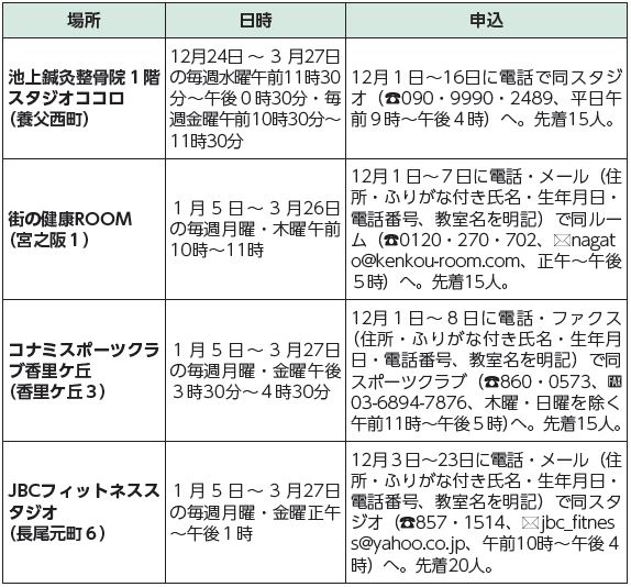 日時など:下表のとおり。各全24回。対象は65歳以上で運動機能の低下が気になる人。参加は年度に1回。最終日にアンケートへの回答が必要。無料。各開催場所へ申し込みを。