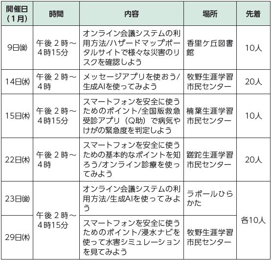 申込:12月1日から市ホームページの専用フォームまたは電話・ファクス(住所・氏名・年齢・電話番号、講習会名、希望日を明記)で健康福祉政策課へ。