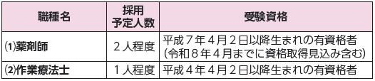 職種は下表のとおり。11月の試験で定員に達すれば募集をしない場合があります。採用は令和8年4月1日または令和7年度中。