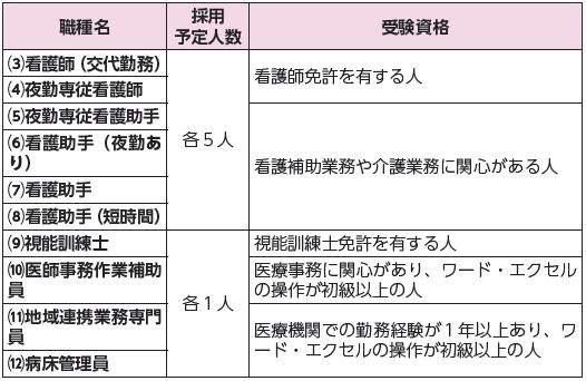 申込:(1)募集中。12月10日まで(2)12月1日~26日(3)~(12)随時受け付け。所定の申込書(募集要項とともに同病院ホームページから取り出し可)、必要書類、住所・氏名を書き110円切手を貼った返信用封筒を同病院総務課へ。郵送(〒573-1013禁野本町2-14-1。簡易書留郵便に限る)可。複数職種の申し込みは不可。受験資格などの詳細は募集要項参照。