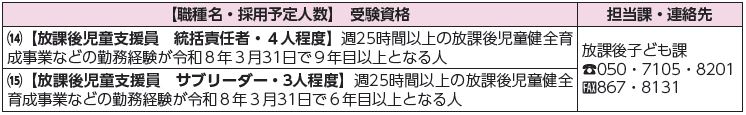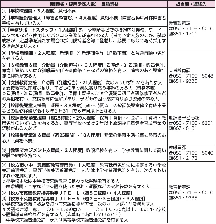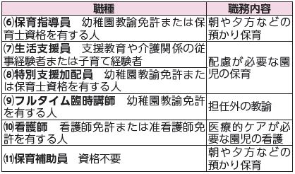 職種は下表の通り。勤務時間、報酬など条件は職種によって異なります。雇用期間は来年4月1日から1年間(再度任用の場合あり)。資格・免許はいずれも採用日前日までに取得見込みであること。募集要項などは各担当課と輝きプラザきらら3階教育政策課で配布(市ホームページから取り出し可)。