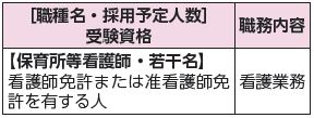 職種は下表の通り。任用期間は来年4月1日から1年間(再度任用の場合あり)。勤務は各保育所等で週38時間45分(シフト勤務あり)。年齢要件なし。