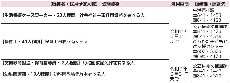 採用は来年4月1日付け。雇用期間は(1)職種により異なります(2)いずれも令和9年3月31日まで(再度任用の場合あり)。受験資格は採用日の前日までに取得見込みを含む。複数職種の申し込み不可。