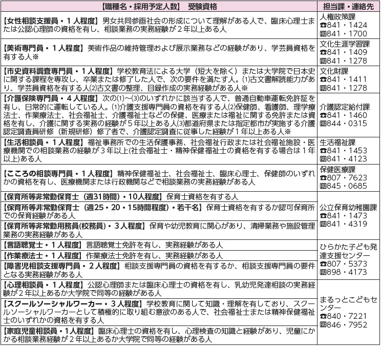 申込:12月1日から9日に市ホームページの専用サイトから人事課へ。詳細は12月1日までに公開する募集要項(各担当課で配布。市ホームページからも取り出し可)参照。インターネット環境が利用できない場合は同課へお問い合わせを。